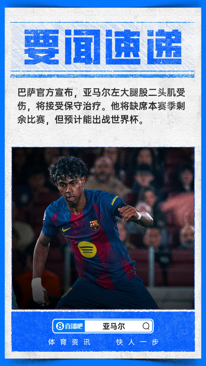 4月23日,巴萨官宣18岁西班牙前锋亚马尔左腿股二头肌受伤,将接受保守治疗,他赛季报销但预计能赶上世界杯。