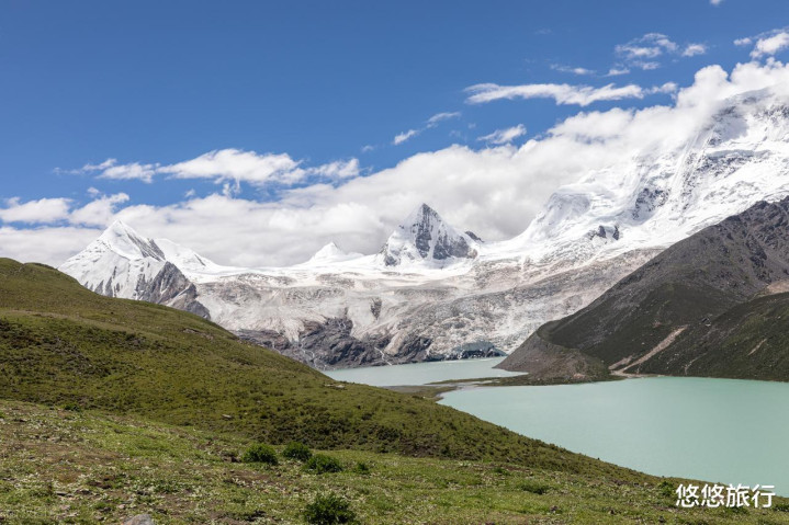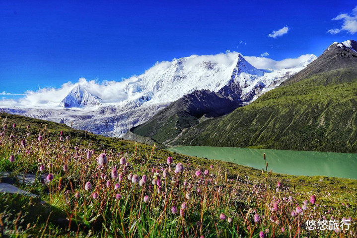 雪山脚下的外湖温婉易达,内湖毗邻冰川。尤其是阳光下的冰渍湖,蓝绿色如同宝石。湖边有大经幡,随风飘扬在圣湖和雪山之下。草坪湿地只有6-8月是绿色,野花的生命周期稍纵即逝。