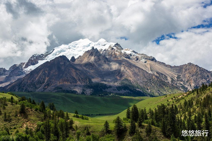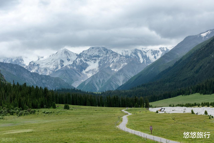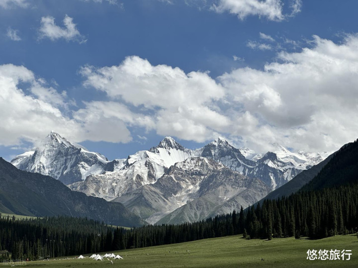 伊犁草原各有特色,夏塔的独一无二在于这里的雪山在夏季依然积雪厚重。雪山、草原、云杉同框,是伊犁其他草原不可替代的。