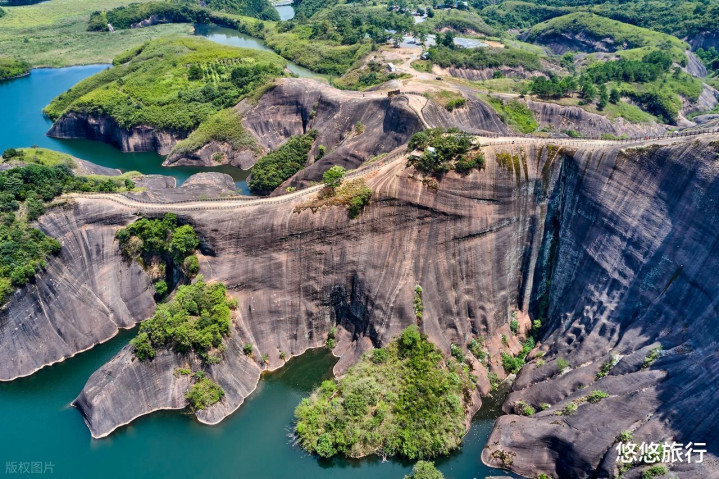 龙脊背丹霞核心主峰,狭长赤色山脊蜿蜒起伏,两侧皆是悬崖碧水。